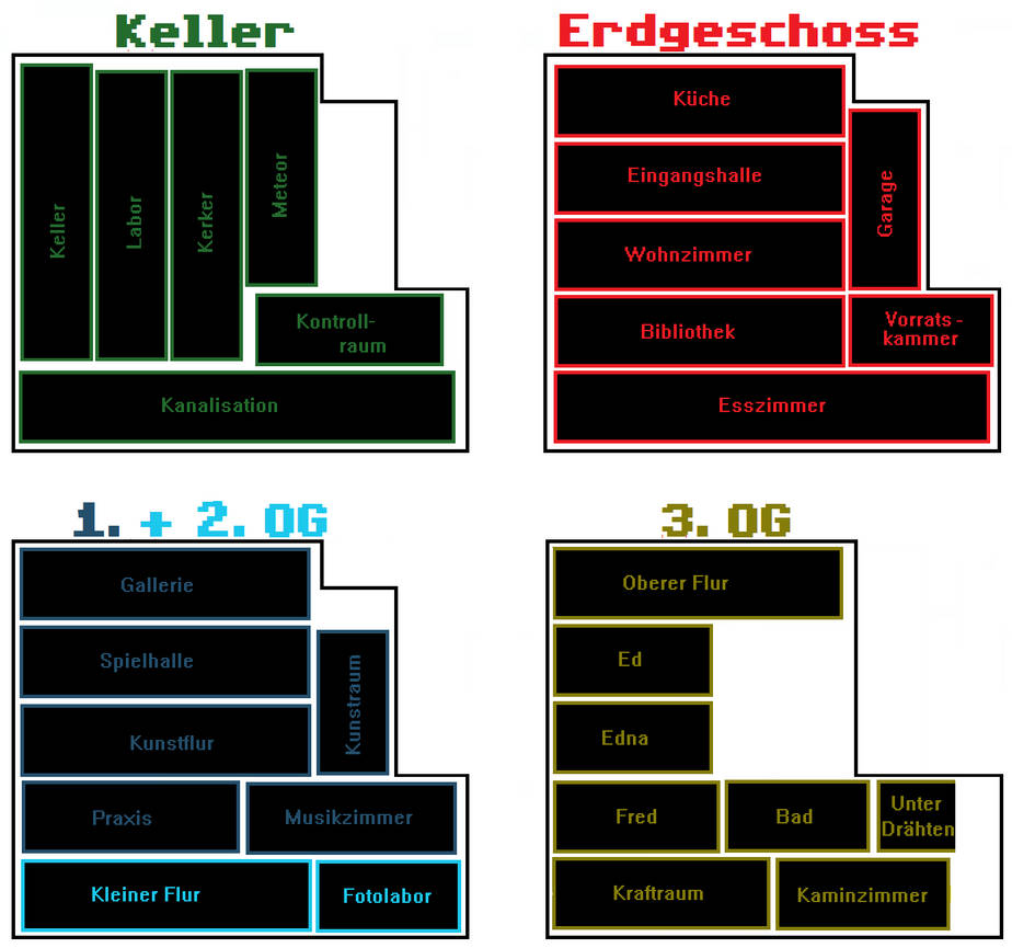 Ich hab mir in letzter Zeit immer wieder Gedanken zum Raumplan vom Maniac Mansion gemacht und ich dachte, vielleicht interessiert es ja hier noch jemanden :D . Ich hab mal versucht die Stockwerke zu einem Plan zusammenzustellen.